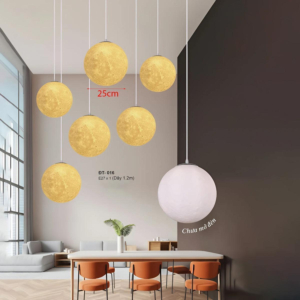 Chọn cầu lớn (20-30cm) ít số lượng (3-5 cầu), khung kim loại đen mờ. Đặc biệt phù hợp với phòng khách thông tầng — bạn có thể tham khảo thêm đèn thả thông tầng kim loại để có thêm lựa chọn cho không gian trần cao.