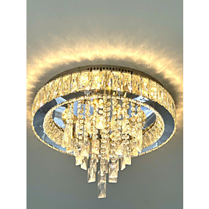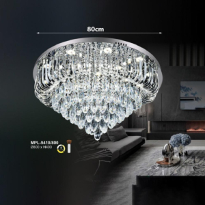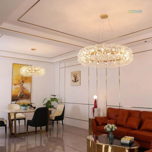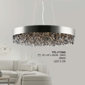 Đèn chùm pha lê hiện đại nổi bật bởi kết cấu tầng tròn, bậc thang hoặc thác đổ với những viên pha lê K9 trong suốt được cắt máy chính xác. Khung đèn thường làm từ inox 304 mạ chrome, mạ vàng champagne hoặc sơn tĩnh điện đen, mảnh và nhẹ. Nguồn sáng chủ đạo là bóng LED tích hợp với nhiệt độ màu linh hoạt 3000K-6500K, cho phép đổi ánh sáng vàng ấm hoặc trắng lạnh tuỳ tâm trạng. Loại đèn này thường có chiều cao buông thấp hơn 80-120cm, phù hợp trần 2,8m-3,2m phổ biến ở căn hộ chung cư hiện nay.