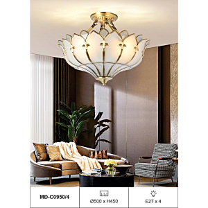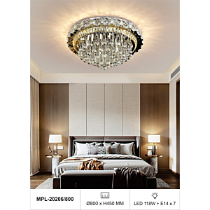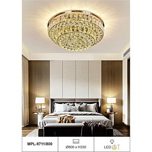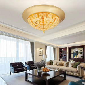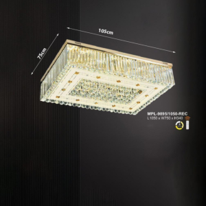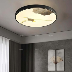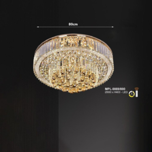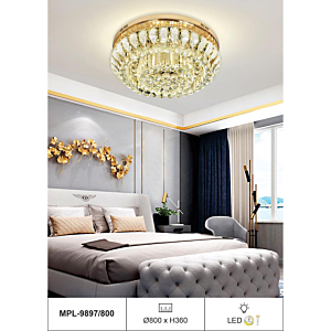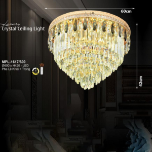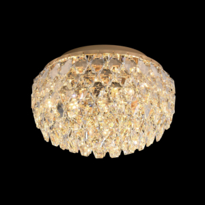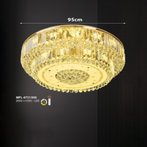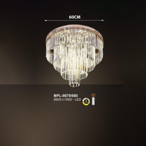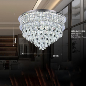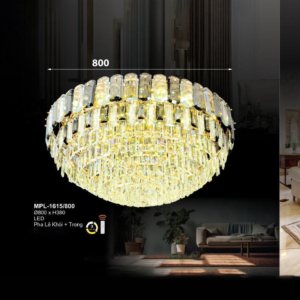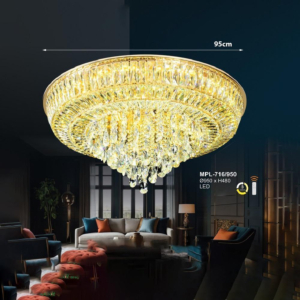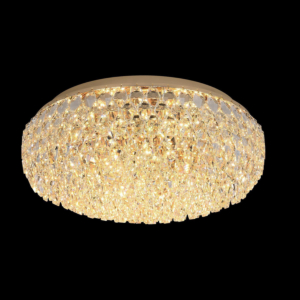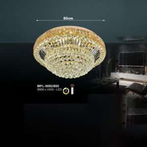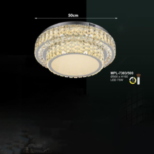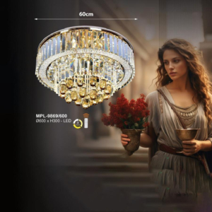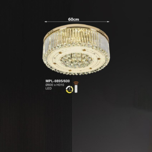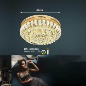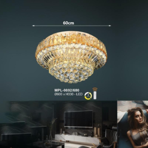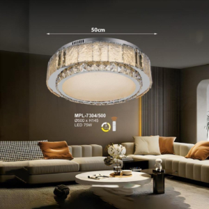 Phong cách tân cổ điển – pha lê: Đèn mâm ốp trần pha lê K9 với thiết kế hoa sen, hoa cúc hoặc mặt trăng. Đường kính 60–90cm, độ dày chỉ 10–15cm, bám sát trần. Hệ thống LED 3 chế độ màu tích hợp sẵn điều khiển từ xa – vừa tiện lợi vừa tạo hiệu ứng ánh sáng lung linh qua các hạt pha lê. Phù hợp phòng khách 15–20m² với trần từ 2.6m.