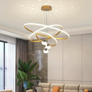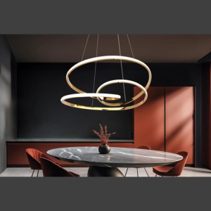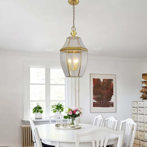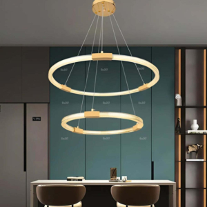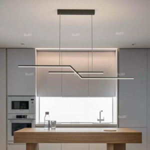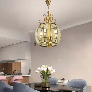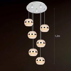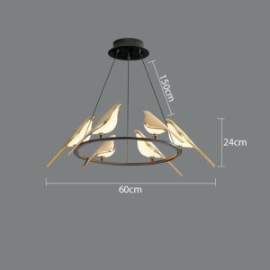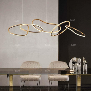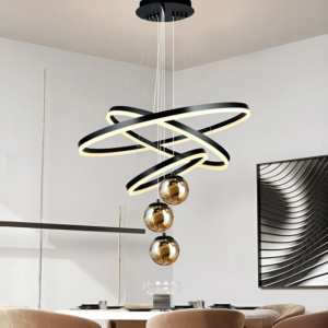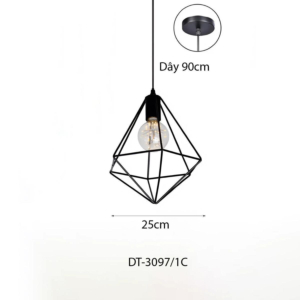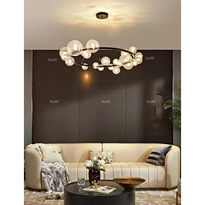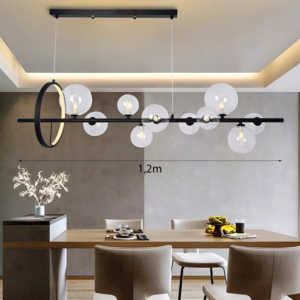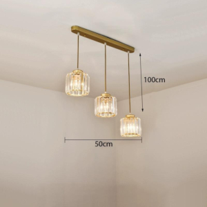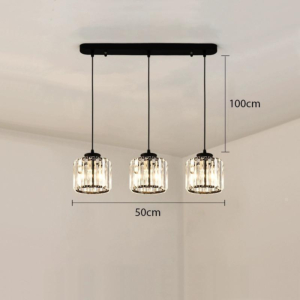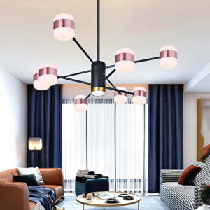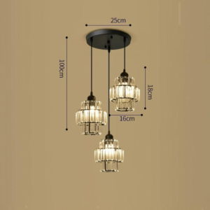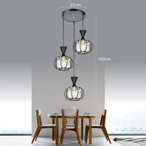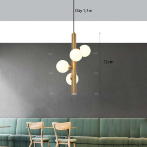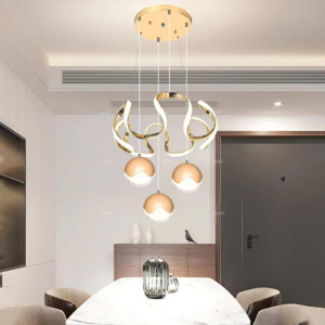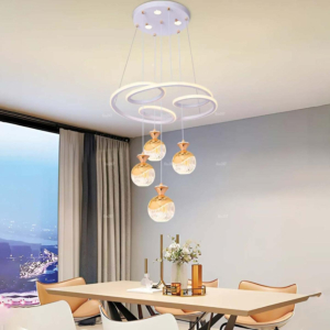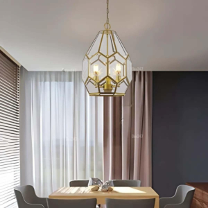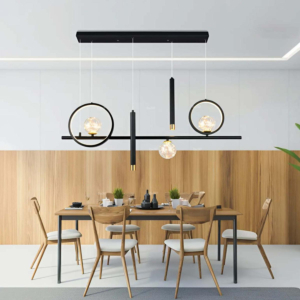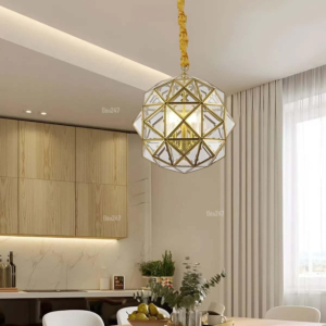 Phong cách Bắc Âu sáng tạo: Đèn chùm khung kim loại kết hợp chao thủy tinh hoặc acrylic, tạo hình hình học độc đáo. Chiều cao 30–40cm, dây treo có thể điều chỉnh linh hoạt. Thích hợp cho phòng khách mở liên thông bếp – phòng ăn, giúp phân vùng không gian bằng ánh sáng mà không cần vách ngăn vật lý.