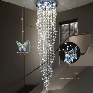 Đèn chùm thông tầng khách sạn chiều dài 3.5m là loại đèn trang trí nội thất có kết cấu thả dọc từ trần xuống không gian thông tầng, với tổng chiều dài thân đèn khoảng 3.5 mét. Khác với đèn chùm phòng khách thông thường chỉ dài 0.5–1m, đèn chùm thông tầng sở hữu tỷ lệ đồ sộ hơn rất nhiều, đóng vai trò là điểm nhấn trung tâm kết nối các tầng trong không gian mở.