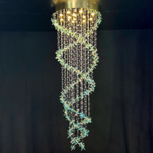 Đèn chùm thông tầng có kết cấu đồ sộ hơn, thường gồm nhiều tầng vòng LED hoặc khung kim loại gắn pha lê xoắn ốc. Dạng đèn này tạo hiệu ứng tán sắc ánh sáng mạnh mẽ, đặc biệt khi sử dụng pha lê K9 – loại pha lê có chỉ số khúc xạ cao nhất, tạo ra hiệu ứng cầu vồng rực rỡ dưới ánh sáng. Trọng lượng thường từ 15-40kg, yêu cầu trần bê tông cốt thép và ty ren chịu lực. Đèn chùm thông tầng phù hợp cho biệt thự, nhà phố có ô cầu thang rộng từ 1.5m trở lên và gia chủ yêu thích phong cách tân cổ điển hoặc luxury.