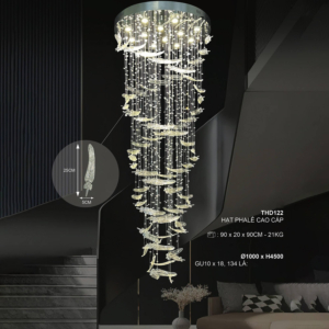 - Đa dạng mẫu mã: Hàng trăm mẫu đèn thả, đèn chùm, đèn ốp trần thông tầng với đầy đủ chất liệu từ pha lê K9 đến inox cao cấp