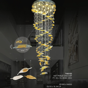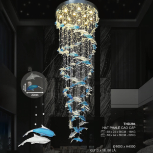 - Chất liệu: Pha lê K9, thủy tinh cao cấp, inox mạ, đồng nguyên chất – LED tiết kiệm điện