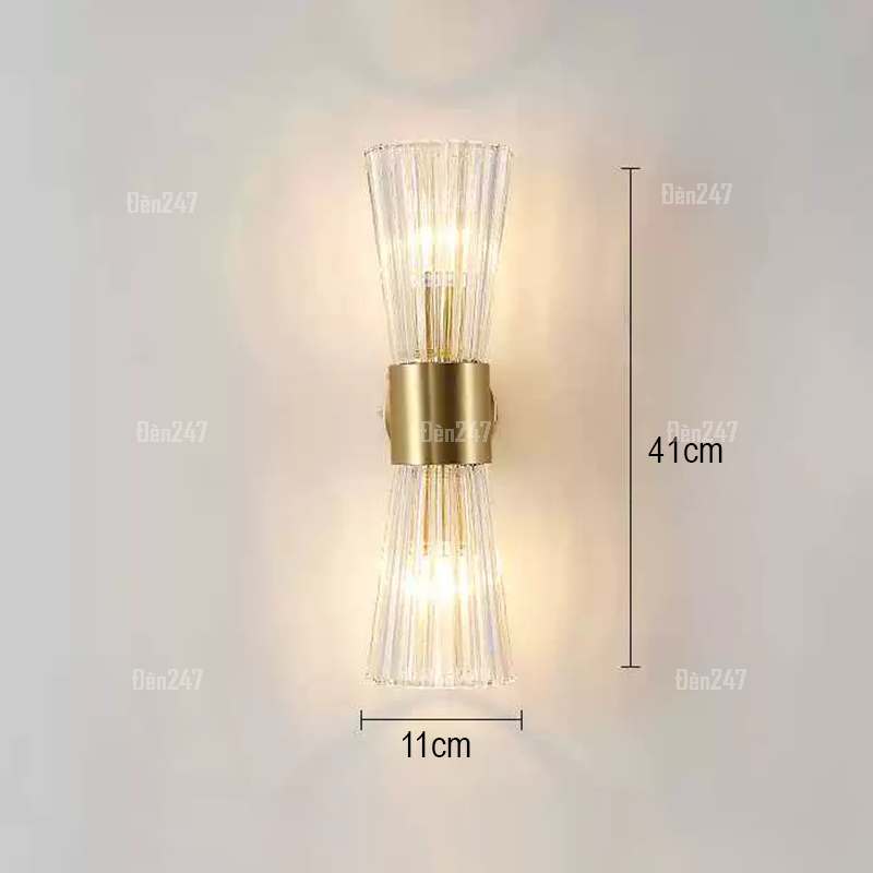 Chất liệu: Hợp kim màu vàng. Chóa đèn nhựa Acrylic tản sáng, hình chóp