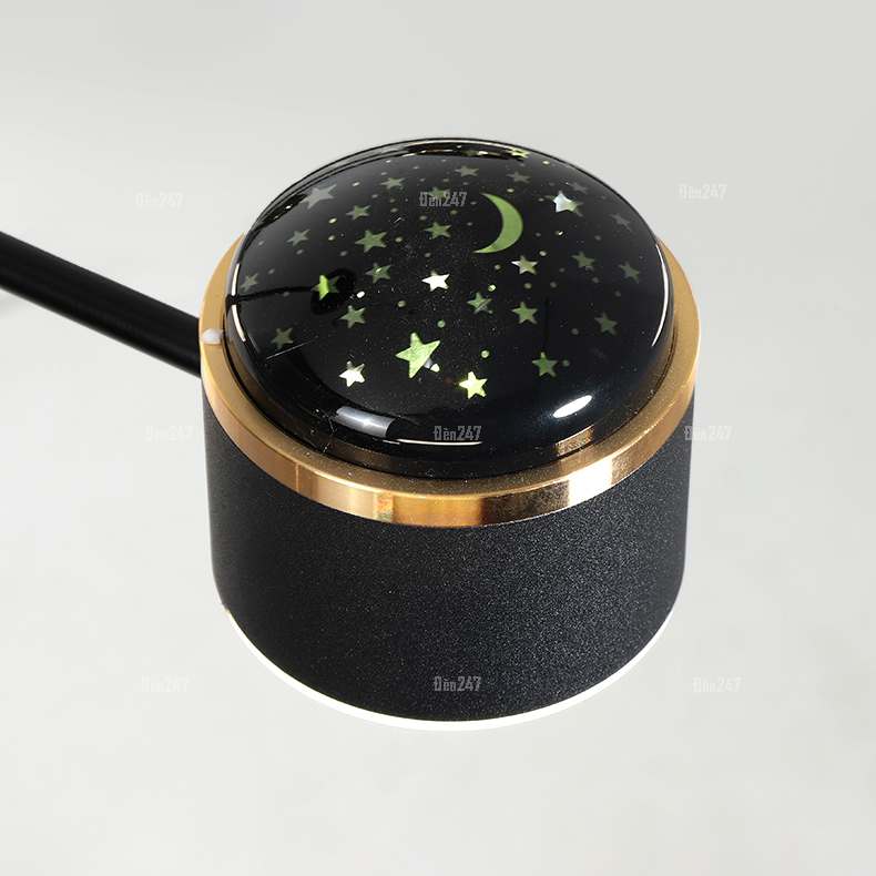 Đặc điểm: Đèn được thiết kế với 9 bóng đèn gồm: 4 bóng đèn hình tròn thân màu vàng 24K, hắt sáng phía trong và 5 bóng đèn rọi xuống phía dưới, 1 đầu hắt sáng hình sao, trăng lên trần nhà. Các bóng đèn được bố trí xen kẽ nhau.