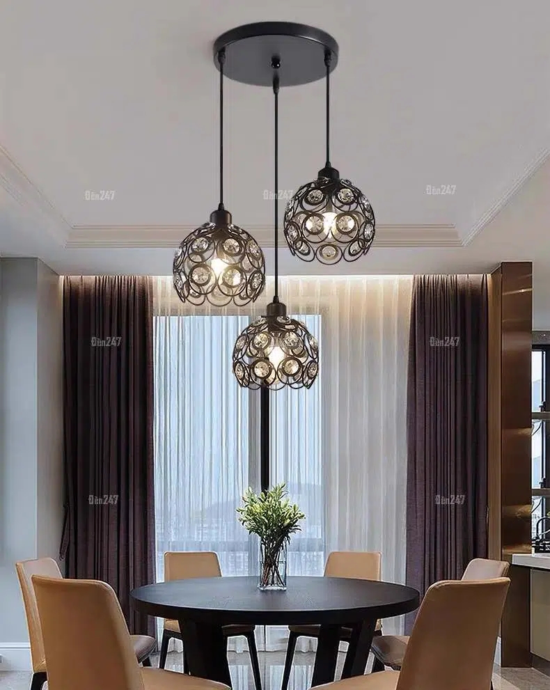 Đặc điểm: Đèn được thiết kế dạng hình cầu lưới có lỗ rỗng, bên trong lỗ rỗng đính pha lê. Mỗi đèn có chiều dài thay đổi, có thể điều chỉnh chiều dài mỗi đèn. Đèn được cấu tạo với chóa màu vàng, thân màu đen.