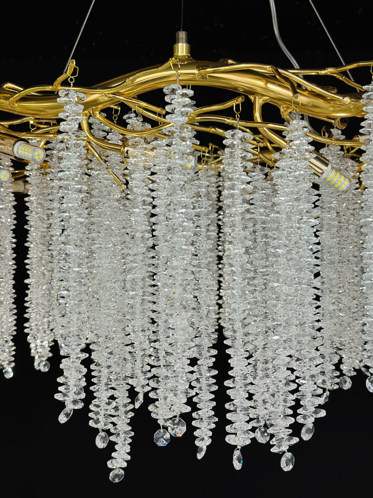 Đèn chùm TPL912T800 là một tác phẩm nghệ thuật chiếu sáng mang phong cách thiên nhiên tinh tế. Với thiết kế dạng tròn mô phỏng những cành cây vàng uốn lượn kết hợp cùng các chuỗi pha lê rủ dài, đèn tạo nên hiệu ứng thị giác như một thác nước ánh sáng lộng lẫy và sang trọng cho không gian nội thất.