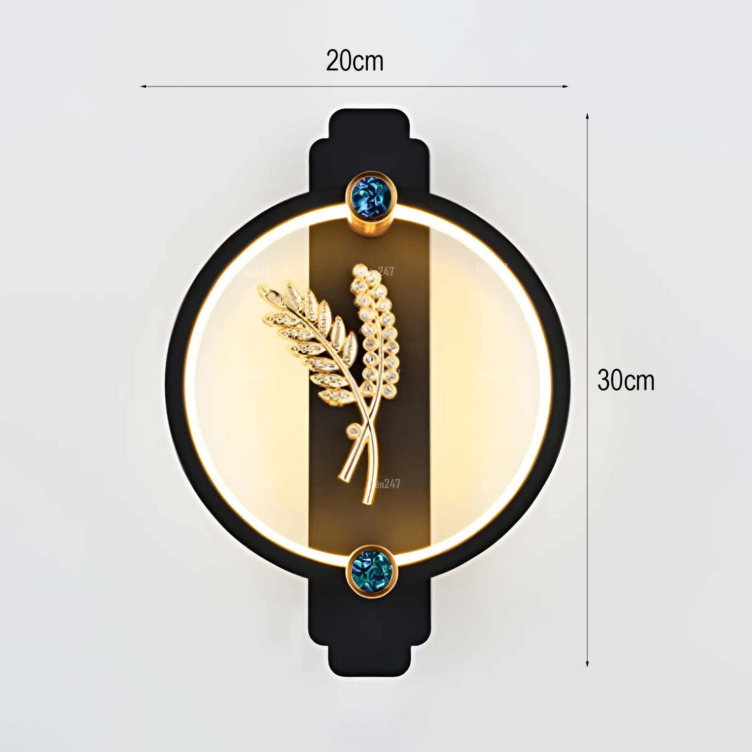 Đặc điểm: Đèn màu đen hình tròn. Hai đầu có đính xà cừ. Ánh sáng từ phía trong hắt vào hình bông lúa trong vòng tròn