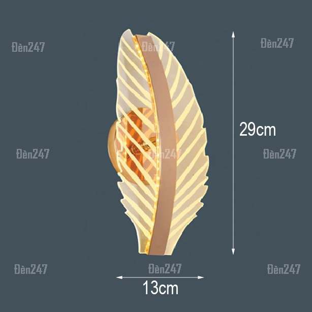 Chất liệu: Hợp kim màu vàng đồng + Mica hình lá cây phát sáng toàn bộ đèn khi bật đèn.